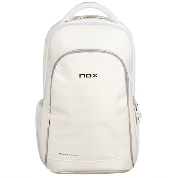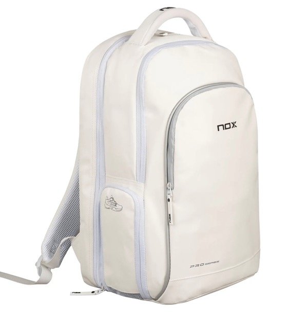 Mochila PRO de NOX: dos compartimentos principales, sistema de aireación para zapatillas y correas ergonómicas. Capacidad de 28L en un diseño funcional y clásico en color blanco.